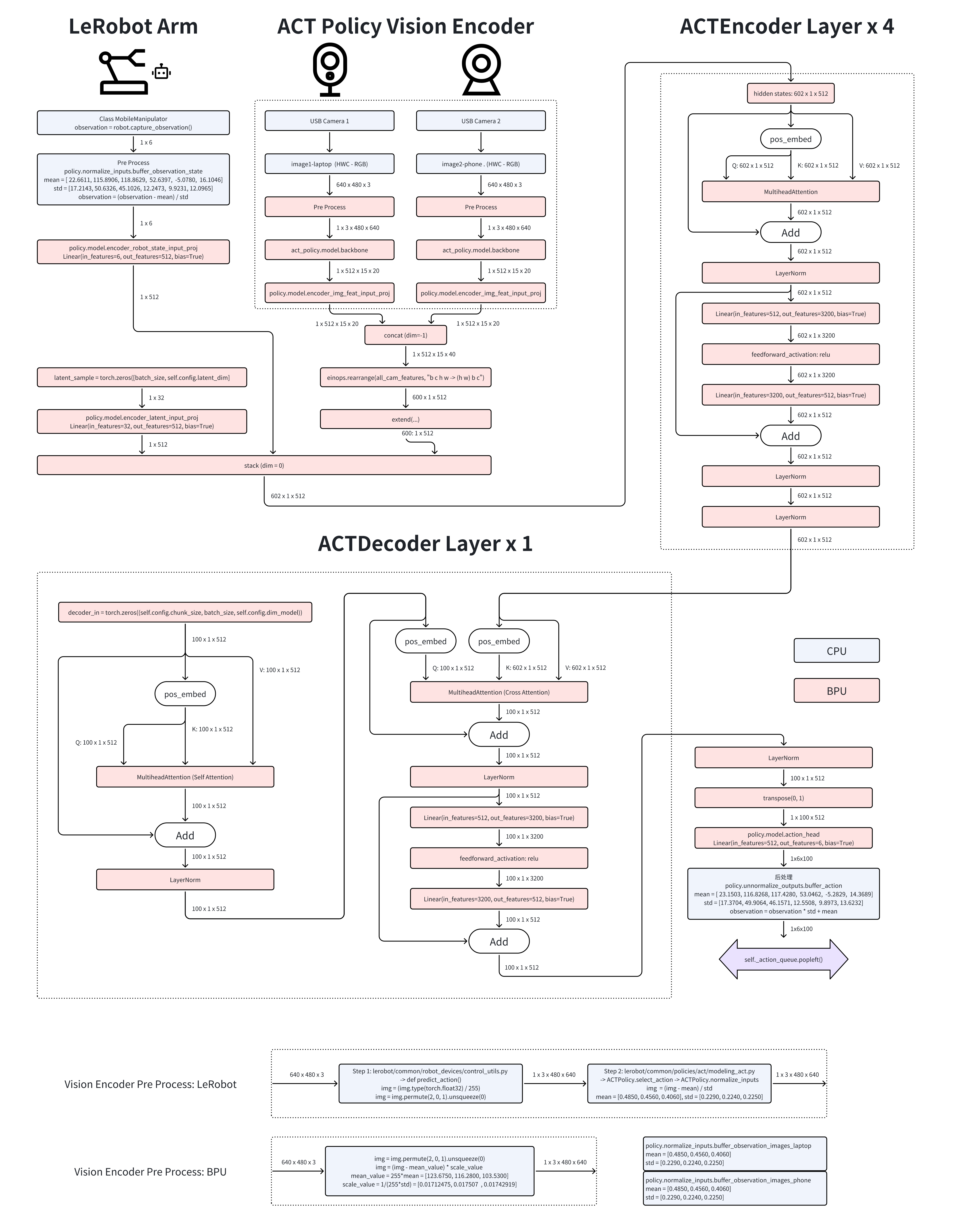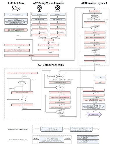 Since the vision encoder is invoked multiple times (once per camera), it is exported separately under the name BPU_ACTPolicy_VisionEncoder. Subsequently, image tokens and action tokens are fed into the encoder and decoder layers, which are exported as BPU_ACTPolicy_TransformerLayers.