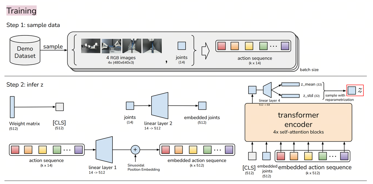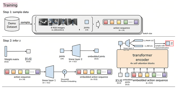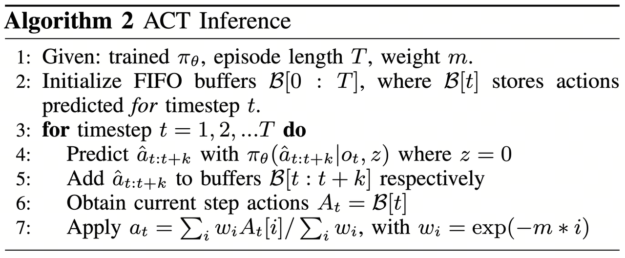 For example, if B = 32, chunk_size = 10, action_dim = 6, and L = 64, the output action sequence batch will have shape (32, 10, 6), and the latent PDF parameters will have shape (32, 64). During execution, ACT uses inference strategies to smooth predictions and reduce error accumulation.