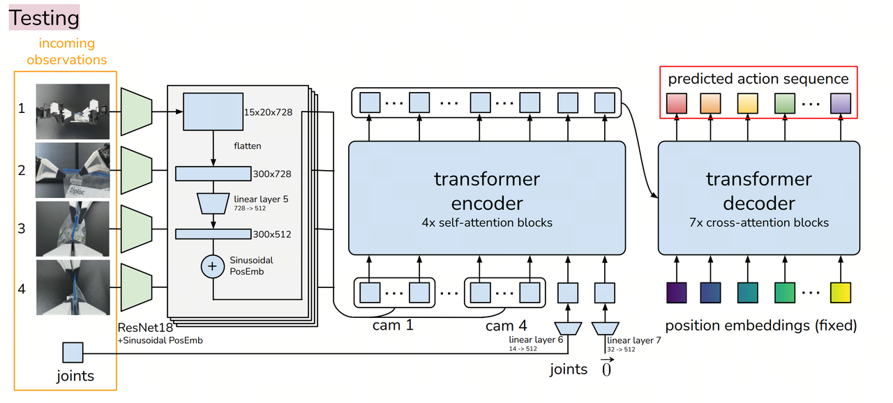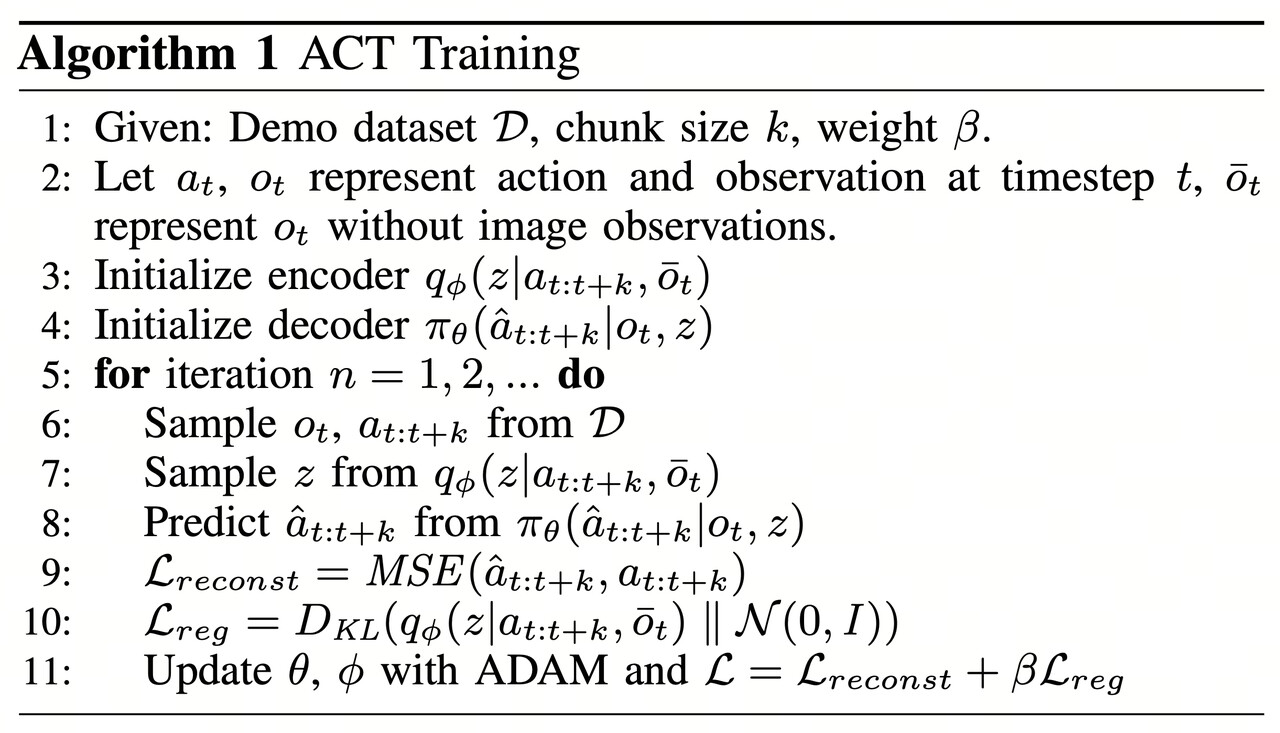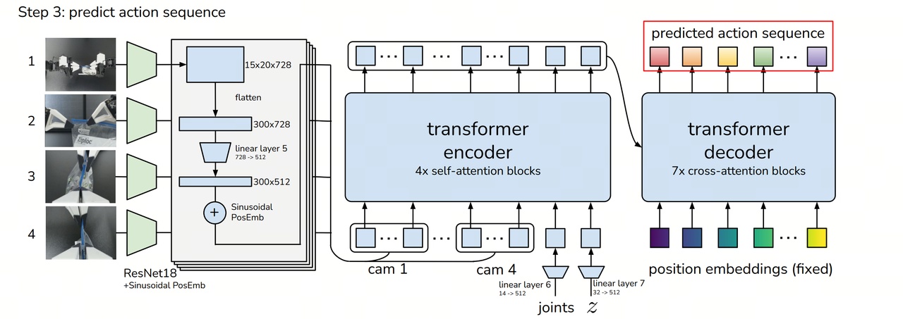 - Instead of predicting single actions step-by-step, the robot predicts k-step action sequences at a time.