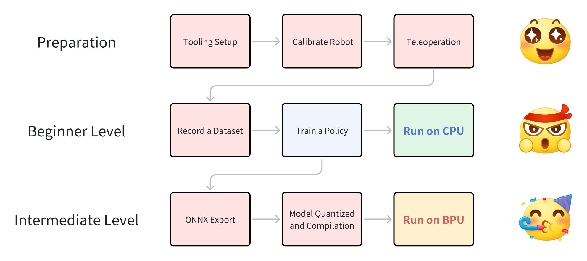 - Hugging Face community is active, LeRobot is a popular project with significant influence domestically and internationally, offering a complete workflow from dataset collection, training, toolchain quantization, to BPU deployment.