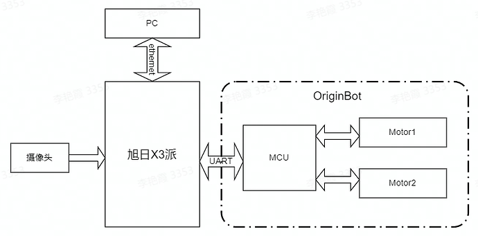 The OriginBot kit is selected here. The car body has two driving wheels and one driven wheel, and the rotation control is carried out through the differential speed of the two driving wheels. The MCU module is mainly used for the motor motion control of the car to communicate with the main control X3pi through the serial port.
