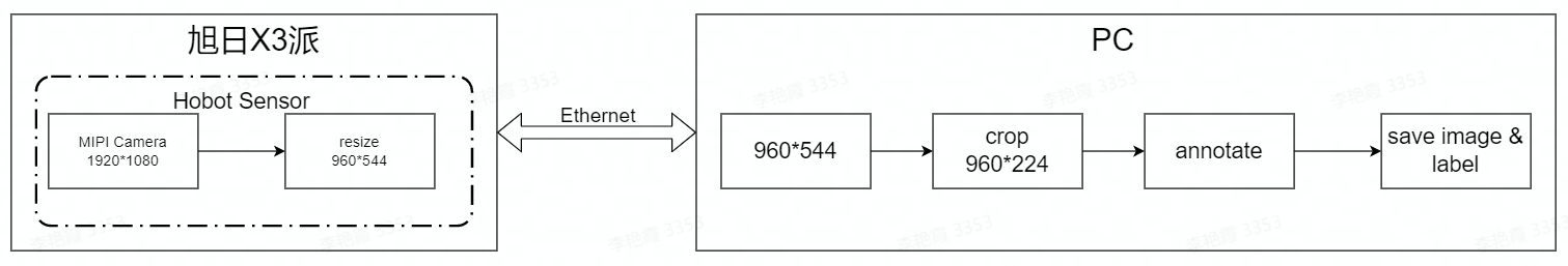 Model training can’t be done without data acquisition and annotation. Here, we can build a simple data acquisition and annotation system on a PC using the mipi camera image acquisition capabilities and cross-device communication capabilities provided by TogetherROS’s hobot Sensor. The workflow of the entire data acquisition and annotation system is as follows: