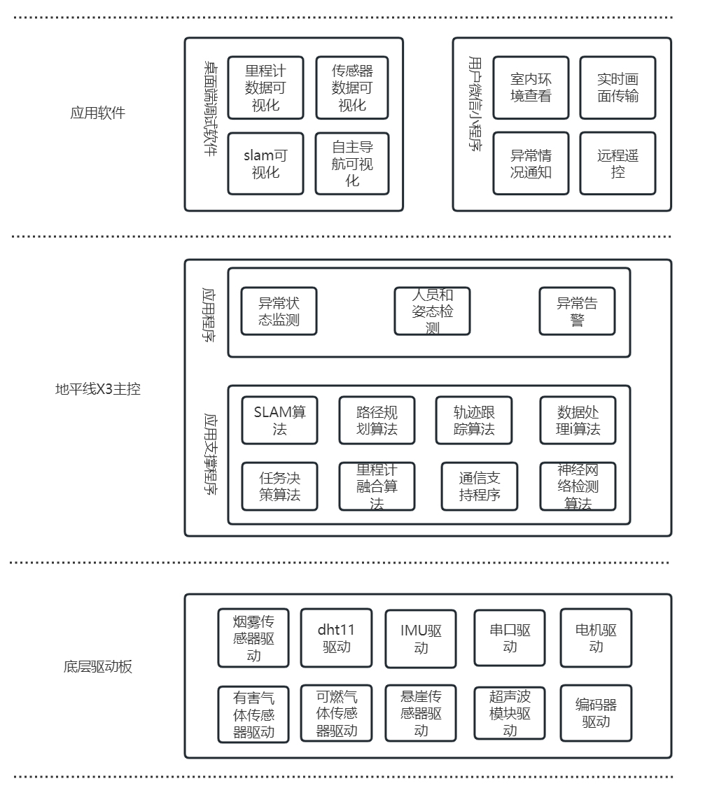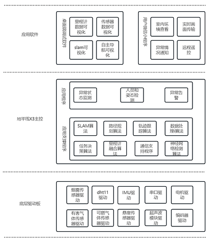 There are mainly two types of programs in the X3 main control: one is the basic program used for application support, including SLAM algorithm, odometer fusion algorithm, path decision algorithm, etc. These algorithm programs are the support for autonomous mobile robots and the key to enabling robots to move autonomously. Another type is some customized applications based on the above algorithms. As this robot is mainly used for patrol and security checks, only customized application functions are made for this area. Users can make changes as needed during secondary development.