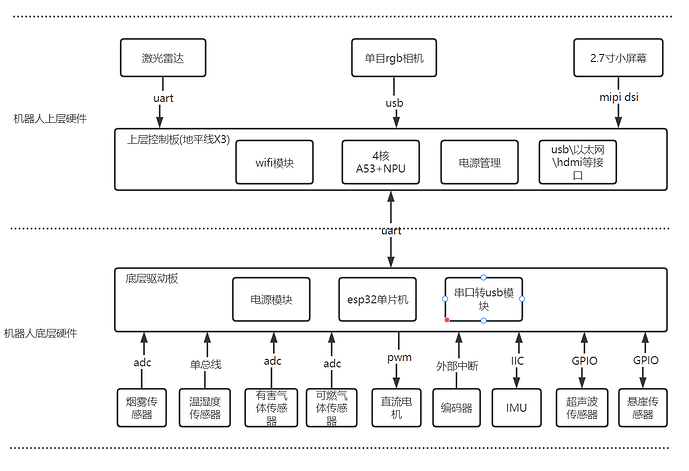 The hardware design of the robot adopts a layered design approach, using two controllers: for the data collection of various sensors at the bottom layer and the control of the robot’s motion part, a low-cost and relatively low performance microcontroller is used, while for the upper layer, the algorithm operation of the robot needs to be completed, and high computing performance devices such as cameras and LiDARs need to be driven. Therefore, the microcontroller is no longer able to meet the requirements, and a powerful embedded SOC needs to be used to complete it. I used the X3 Pi from Horizon here, which has a main frequency of up to 1.2GHz and four A53 cores. It is equipped with a WiFi module and, more importantly, an NPU computing unit with a computing power of up to 5Tops. In subsequent use, it can be used in conjunction with a monocular RGB camera to perform various functions such as personnel detection and human posture detection.