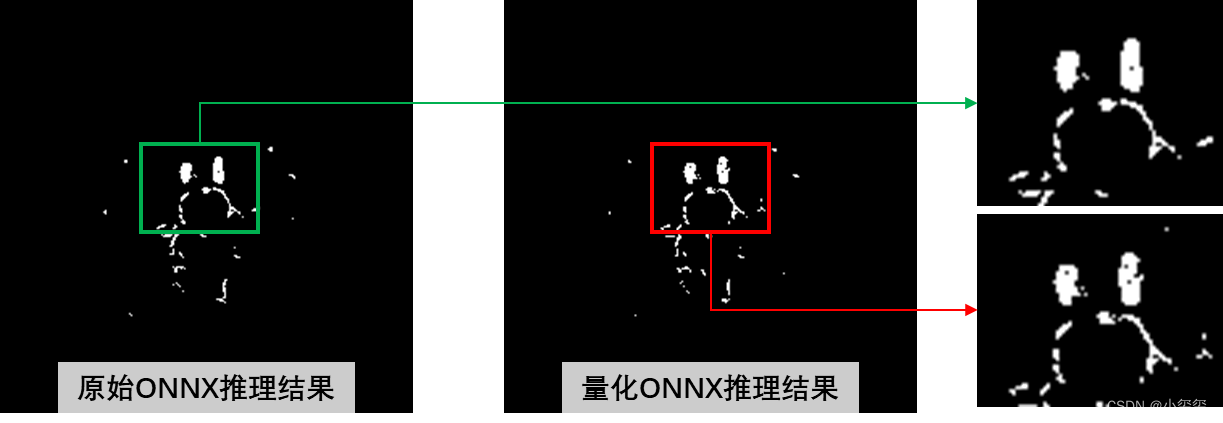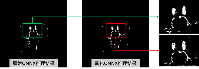 从下图可以看出,量化ONNX的推理结果和原始ONNX推理结果,主体上是相似的,局部有细微的差异(量化必然存在或多或少的精度损失,大部分情况下是可用的)。
