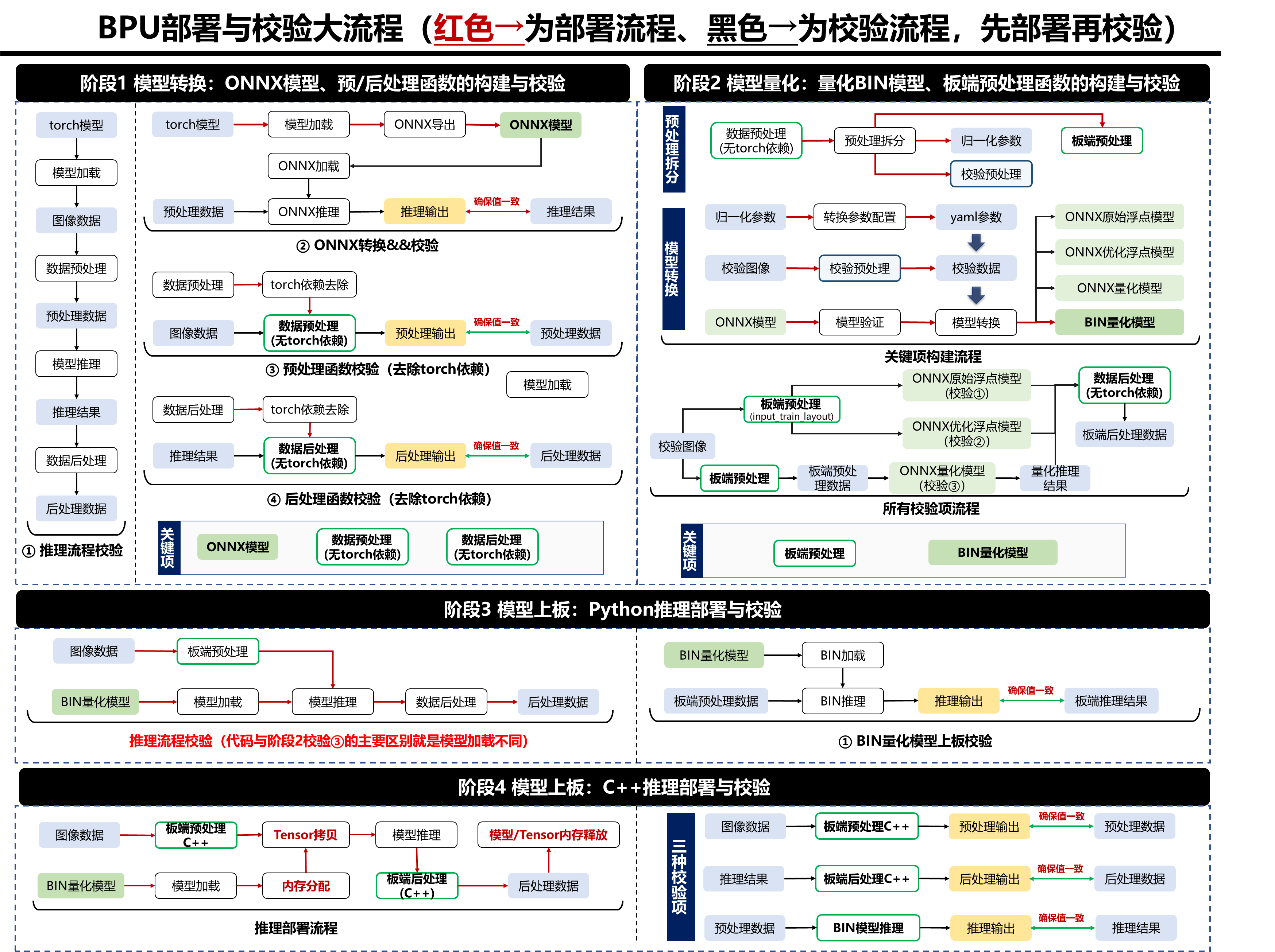 规范化导图的设计改了多个版本,最终BPU整个部署大流程如下图所示,从Pytorch模型开始,到最终开发板BPU推理出目标结果为止,展示了整个环节需要处理的内容。整个流程看似节点较多,较为繁琐。但实际上,只需要重点关注绿色框相关内容,剩下部分就是固定化操作。在部署的整个流程中,切记要保持转换函数/模型的结果一致性,简单来说,在整个部署流程中,我们要保证预处理后处理函数,转换后的模型能够跟原始模型有一样的输出。